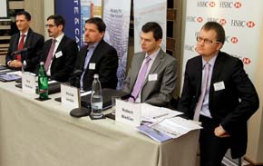 Exportéři a duševní vlastnictví Na semináři pro české exportéry v rámci projektu HSBC Grant vystoupili (zleva): ředitel finančního oddělení HSBC Bank Filip Koutný, advokát kanceláře White & Case Jakub Menčl, ředitel mediální agentury utd. by content Petr Stránský, Michal Jordán z firmy Linet a šéfkomentátor týdeníku Ekonom Robert Břešťan.