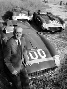 Enzo Ferrari se svými vozy před zahájením vytrvalostního závodu Tisíc mil v roce 1956.