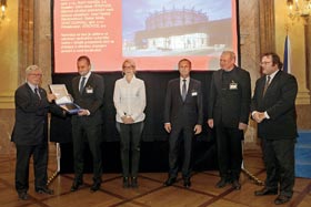 Stavbou roku je aula Gong Multifunkční aula v Ostravě Vítkovicích získala titul Stavba roku. Na snímku zleva Viktor Logvinov, viceprezident Svazu architektů Ruska, který ocenění předává. Čtveřice oceněných: Petr Koudela, výkonný ředitel Národní kulturní památky Dolní oblast Vítkovice, zástupkyně Vítkovice holding Liběna Světlíková, generální ředitel stavební firmy Gemo Olomouc Jaromír Uhýrek a architekt Josef Pleskot. Zcela vpravo stojí Petr Ivanov, ředitel festivalu Architecture Week Praha, který je generálním partnerem soutěže. Hlavním mediálním partnerem akce je časopis Stavitel vydavatelství Economia.
