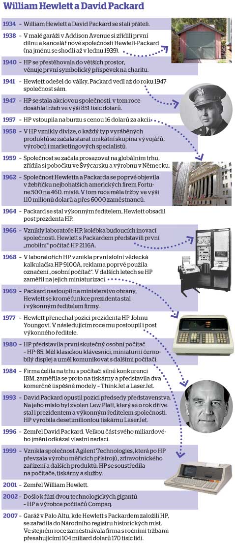 Je první den nového roku 1939. Do začátku válečného běsnění na starém kontinentě zbývá přesně devět měsíců a dva kamarádi ze studií na americké Stanfordově univerzitě, David Packard a William Hewlett, se mohou zabývat přízemnějšími problémy. Přemýšlejí o názvu nové firmy, o níž snili v průběhu uplynulých let. Zní lépe Packard-Hewlett, nebo Hewlett-Packard? Házejí mincí. I když štěstí přeje Packardovi, diplomaticky ustupuje návrhu svého o rok mladšího kolegy - podobný firemní i společenský altruismus ho bude provázet celý život. Z Dava a Billa, jak si oba zakladatele budou pamatovat budoucí zaměstnanci, se oficiálně stávají obchodní partneři. V dílně, kterou si vytvořili uvnitř nenápadné garáže v kalifornském Palo Altu, tím dávají základ budoucímu nadnárodnímu gigantu. Jedné z prvních velkých společností v Silicon Valley, která se za čas bude pyšnit titulem největšího světového prodejce počítačů. Dopracuje se k němu přes výrobu testovacích zařízení, vědeckých kalkulaček, zdravotnického vybavení i laserových tiskáren.