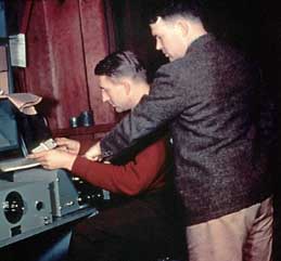 David Packard (sedící) a William Hewlett na snímku z roku 1939 testují v paloaltské garáži svůj první komerčně úspěšný výrobek - audiooscilátor HP 200A.
