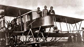 Rok 1914: tříčlenná posádka včetně Sikorského (vpravo) se připravuje na vzlet čtyřmotorového stroje Ilja Muromec.