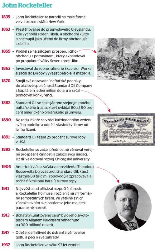 John Rockefeller bývá označován za nejbohatšího muže novodobé historie. Na zelené louce vybudoval americkou naftařskou společnost Standard Oil, která se po střetu s Bílým domem a nuceném rozdělení v roce 1911 stala matkou mnoha velkých ropných firem.
