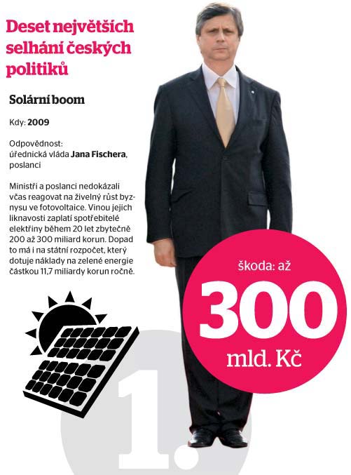 Kde se stala chyba? Vláda v roce 2009 reagovala na růst byznysu se zelenou energií příliš pozdě. Vina padá hlavně na nestranického premiéra Jana Fischera a jeho ministry, ale také na celou Poslaneckou sněmovnu. Spornou roli v celém příběhu sehrál i dominantní výrobce elektřiny ČEZ.