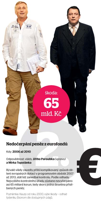 Druhý největší případ selhání českých politiků se odehrál o dva až tři roky dříve. Řeč je o čerpání peněz z fondů Evropské unie. Připomeňme, že v programovém období let 2007 až 2013 měli rozdělit mezi úspěšné žadatele o dotací z evropských fondů částku okolo 700 miliard korun. Dnes je prakticky jisté, že desítky miliard korun zůstanou nevyčerpány.