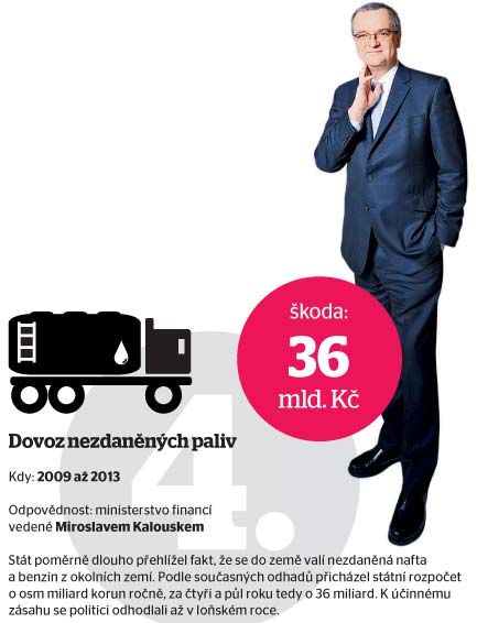 O další peníze přišel stát vinou neuváženého zvýšení spotřební daně z motorových paliv na počátku roku 2011. Zatímco v roce 2010 vybral na této dani 81,4 miliardy korun, loni už to bylo jen 76,6 miliardy. Zejména kamionoví dopravci totiž omezili své zastávky u českých pump a dali přednost naplnění nádrží levnější naftou v sousedních státech.