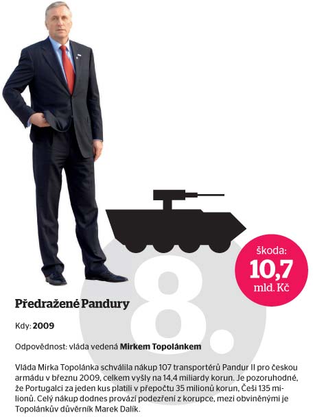 Druhou pětici velkých politických selhání tvoří skupina kauz, u nichž lze hovořit o ztrátě okolo deseti miliard korun. Spadá mezi ně podezřelý tendr na výběr mýtného na dálnicích, pražský tunel Blanka, předražený nákup rakouských obrněných transportérů Pandur II, prohraná arbitráž s americkou CME a také byznys s ubytovnami pro sociálně slabé (více v grafice dále).