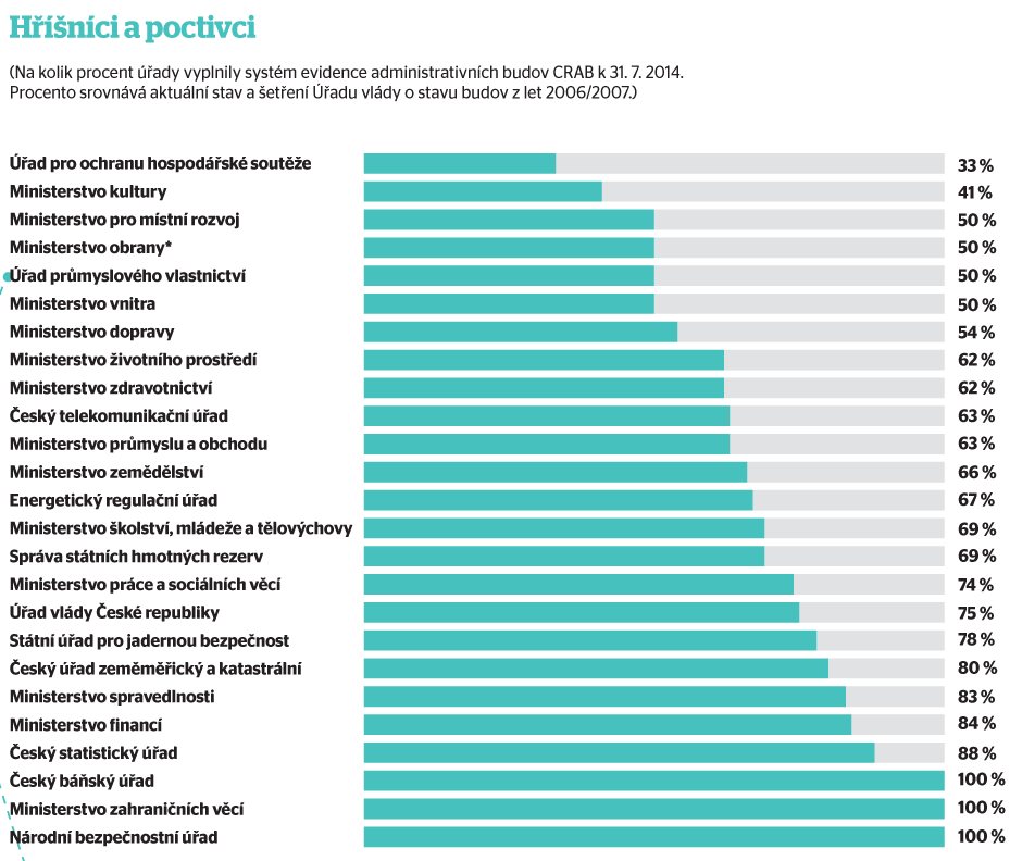 (Na kolik procent úřady vyplnily systém evidence administrativních budov CRAB k 31. 7. 2014. Procento srovnává aktuální stav a šetření Úřadu vlády o stavu budov z let 2006/2007.)