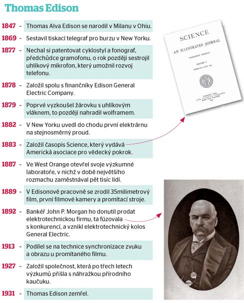 V prvních žárovkách zářil uhlík v podobě zuhelnatělého bavlněného vlákna, papírového proužku a později i třísky bambusu. Brzy ale přišel na to, že lepší bude wolframové vlákno. K podniku se světlem byly potřeba velké peníze, a tak se Edison dopředu spojil s řadou finančníků v čele s ostříleným bankéřem Johnem Pierpontem Morganem. Vznikla společnost Edison Electric Light Company, která sice nesla vynálezcovo jméno, v níž ale Edison o ničem nerozhodoval.