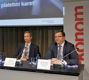 Kam směřují platební karty Na konferenci Budoucnost platebních karet, kterou uspořádalo vydavatelství Economia, vystoupil ředitel odboru metodiky a rozvoje platebního styku ČNB Ivan Fencl (vlevo) nebo koordinátor pro bezkontaktní karty v dopravě ČR Martin Procházka.