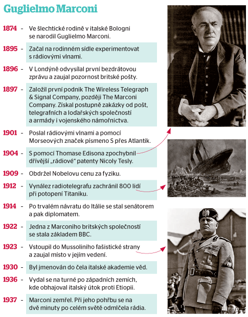 Bezdrátový telegraf, před více než sto lety převratný průlom do světa techniky a tím i do života celé společnosti, který otevřel cestu k rozhlasovému vysílání, je spojen s italskobritským vynálezcem a podnikatelem Guglielmem Marconim. Jako první odvysílal a přijal rádiový signál, dokázal, že vlny doletí z kontinentu na kontinent a dají se využít k přenosu informací. Dovedl toho patřičně využít i komerčně.