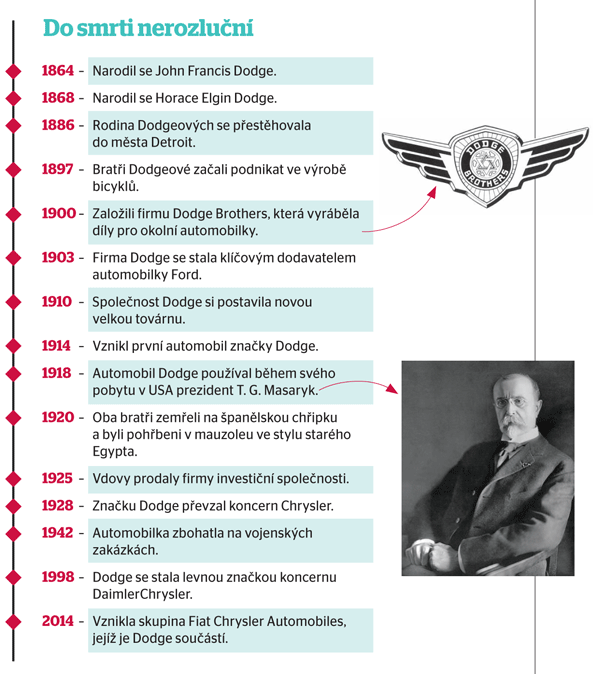 Americká automobilka Dodge neměla jednoho otce. Založili ji dva bratři, John Francis Dodge a Horace Elgin Dodge, kteří přes čtyřletý věkový rozdíl zůstali nerozlučnými druhy v dětství i dospělosti. Společně zázračně zbohatli, vedli divoký život a hodně pili. Oba pak záhy po sobě zabila španělská chřipka. Pohřbeni jsou v monumentální hrobce, kterou si nechali postavit ve stylu egyptských faraonů.