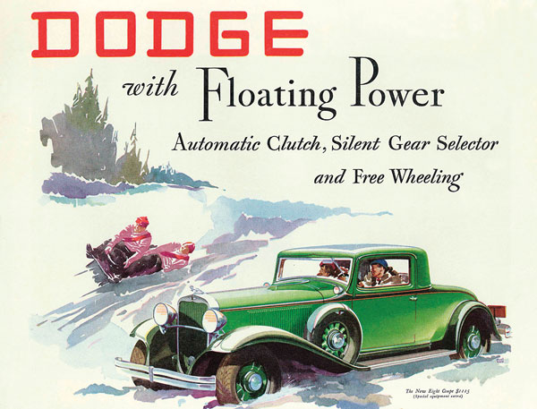 Reklama na kupé Dodge z roku 1932 slibuje například tiché řazení rychlostí.