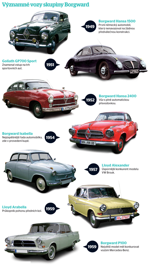 - Používala značky Borgward, Hansa, Lloyd a Goliath.