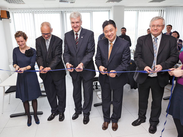 Digitální laboratoř, v rámci které spolupracuje ČVUT a firma Samsung, se slavnostně otevřela v Praze. Na snímku (zleva) Zuzana Zelenická ze Siemensu, děkan Fakulty elektrotechnické ČVUT Pavel Ripka, rektor školy Petr Konvalinka, prezident společnosti Samsung Electronics Czech and Slovak Hun Lee a Boris Šimák z ČVUT.