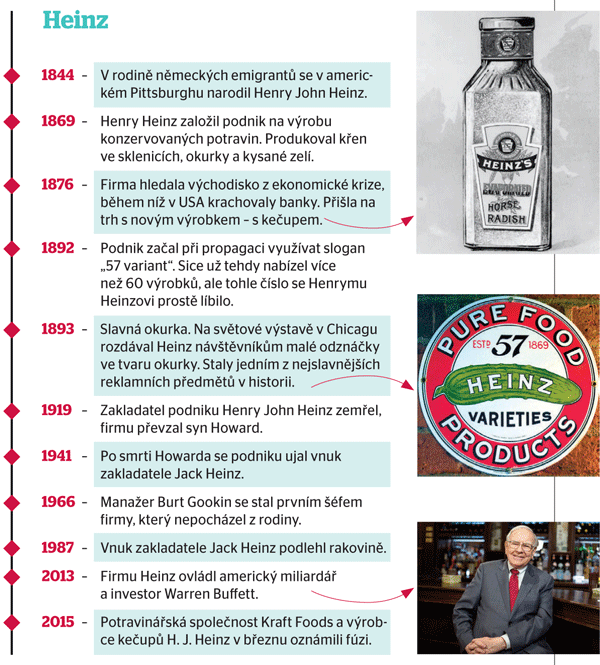 V roce 2013 koupil firmu Heinz miliardář Warren Buffett. Jeho společnost Berkshire získala potravinářský podnik společně s investorem 3G za celkem 23 miliard dolarů. A nyní dokonce tradiční firma kvůli fúzi změní svoje jméno. Letos v březnu společnost Heinz oznámila, že se spojí s americkým gigantem Kraft Foods. Vznikne tak The Kraft Heinz Company a stane se pátou největší potravinářskou skupinou na světě.