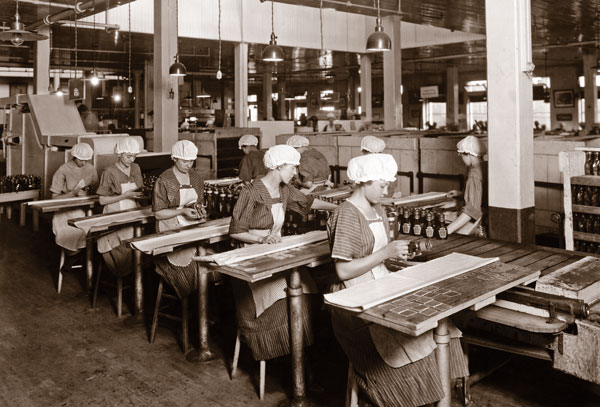 Lepení etiket na kečup. Heinz zaměstnával především ženy.