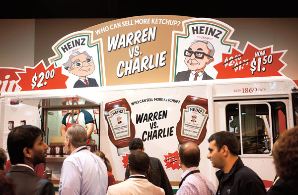 Lahve kečupu s miliardářem Buffettem a Charliem Mungerem z jeho investiční společnosti Berkshire se prodávaly jako připomínka toho, že Buffett firmu ovládl.