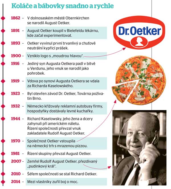 - Zakladatelem firmy byl August Oetker, vynálezce trvanlivého prášku do pečiva.