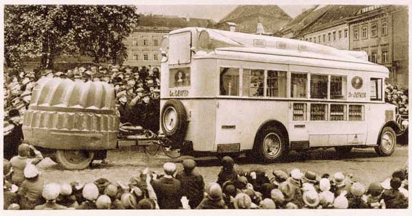 Propagační autobus. Vozidlo s kuchyní, vzorky a promítacím systémem křižovalo ve 30. letech Německem. Proud dodával generátor v přívěsu ve tvaru bábovky.