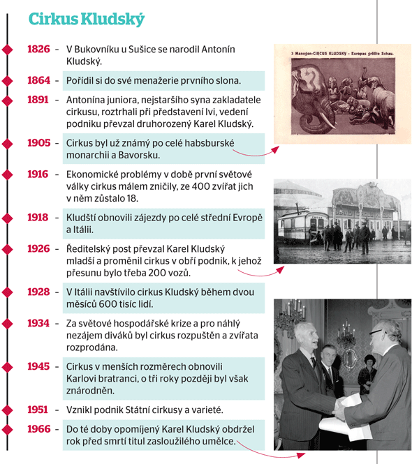 Cirkus Kludský byl po celé střední Evropě pojmem. Za sedm desetiletí ho vybudovala dynastie principálů, z nichž nejslavnějším byl Karel Kludský mladší. Ten ho k největší slávě přivedl v dobách první republiky. Vybudoval velkocirkus, k jehož přesunu z místa na místo bylo třeba několika vlaků. Šlo ale o tvrdý byznys, neustálé střídání pádů a vzestupů, oslnivých úspěchů i nových začátků. Nejen kvůli tvrdé konkurenci v oboru, ale také v důsledku faktu, že poptávka po lidové zábavě sice raketově rostla v době klidu a konjunktury, zatímco války a hospodářské těžkosti dokázaly i kvetoucí podnik zakrátko úplně zničit. Světová hospodářská krize v roce 1934 cirkus Kludský definitivně zlikvidovala.
