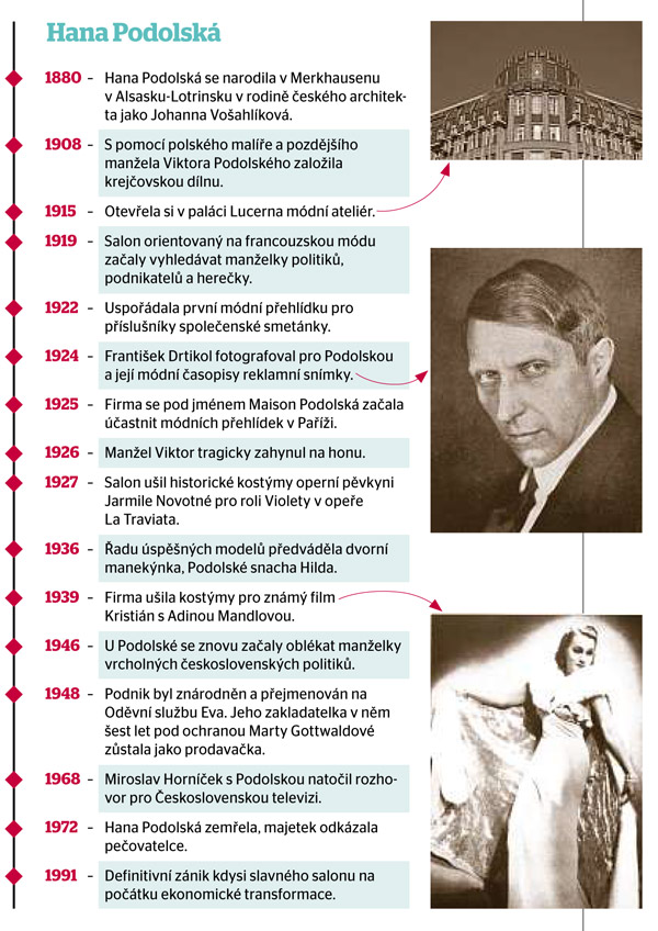 Slova "šiju u Podolské" byla vizitkou lidí, respektive žen, které za první republiky něco znamenaly. A zásluhou úspěšné podnikatelky, která jejich marnivosti vycházela vstříc, se domácí prvorepubliková móda vyšvihla na evropskou úroveň a příliš nezaostávala ani za Paříží, k níž ostatně její prosperující podnik po 20 let vzhlížel.