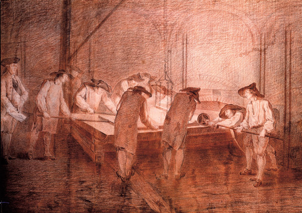 Lití skloviny na kovový stůl. Nová technologie umožnila v 18. století zvýšit produkci a vyrábět větší zrcadla.