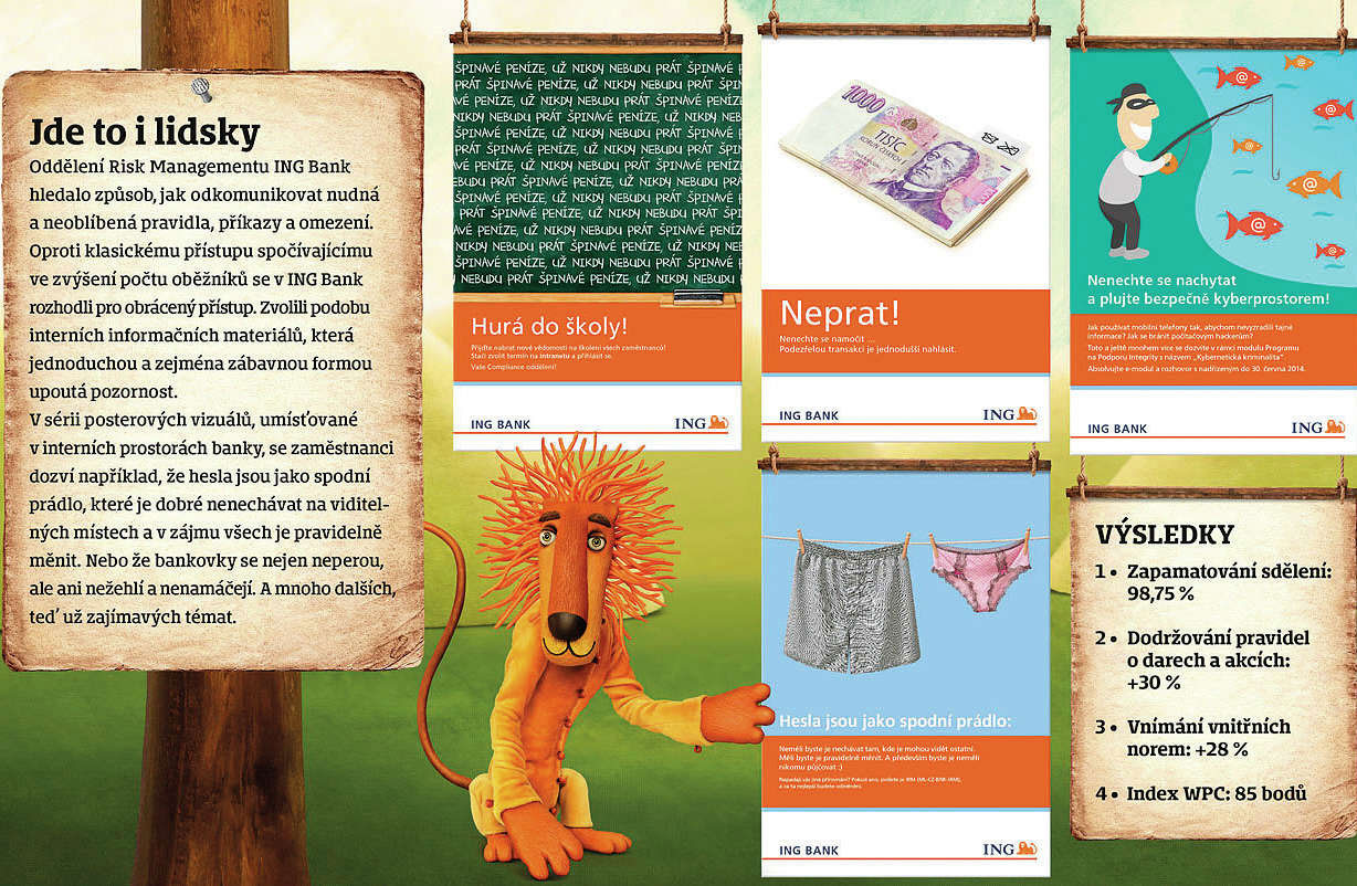 Oddělení risk managementu ING Bank hledalo způsob, jak odkomunikovat nudná a neoblíbená pravidla. Nechtěli zvyšovat počet oběžníků ve firmě, ale vsadili na zábavnou formu komunikace. Připravili sérii posterových vizuálů, které byly v interních prostorách banky. Zaměstnanci se třeba dozvěděli, že hesla jsou něco jako spodní prádlo, které se nenechává na viditelných místech.