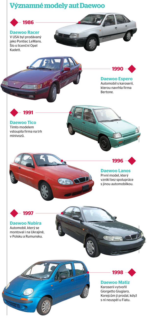 Vláda v Soulu se od 70. let také intenzivně snažila navázat kontakty s Československem. Nakonec se jí to podařilo právě díky firmě Daewoo, jež se uměla pohybovat v arabském světě. Korejci převzali československou pohledávku vůči Libyi s tím, že za zachráněné peníze si zdejší podniky koupí námořní lodě, spotřební elektroniku a automobily Daewoo. Vozy typu Daewoo Racer tak začala Mototechna nabízet v polovině roku 1989. Dodávka zahrnovala tři tisíce kusů. V tomto bodě se ale firma Daewoo dostala do sporu s americkým koncernem General Motors, s nímž měla společný podnik. Sedan Daewoo Racer byl totiž v licenci vyráběný Opel Kadett, který německá společnost do Československa také exportovala, byť s jinou karoserií. A Opel je dceřiná firma GM. Originální vozy Opel se sice u nás prodávaly jen v Tuzexu či přímo taxislužbě, Američané však takové detaily nerozlišovali. Dospěli k názoru, že korejská auta konkurují vozům Opel, a jejich vztahy s Kimem se prudce zhoršily. Firma Daewoo proto mohutně investovala do vlastního vývoje, aby se závislosti na GM zbavila.
