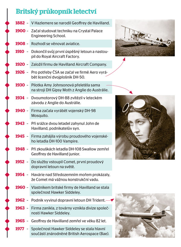 Zakladatel firmy sir Geoffrey de Havilland. Letadla pilotoval, i když mu bylo přes 70 let.