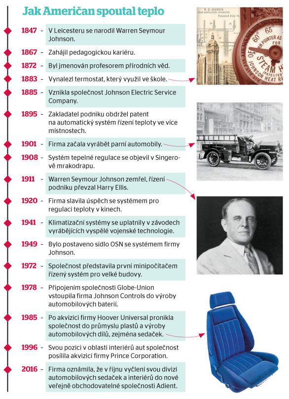 Společnost Johnson Controls se stala technologickým lídrem v oboru automatických systémů tepelné regulace, bez nichž by se neobešly moderní hotely, nemocnice, školy, kanceláře či průmyslové areály. U nás je ovšem firma známá hlavně jako výrobce dílů motorových vozidel. Je totiž také největším producentem automobilových sedaček na světě, přičemž řadu výrobních závodů má v Česku a na Slovensku.