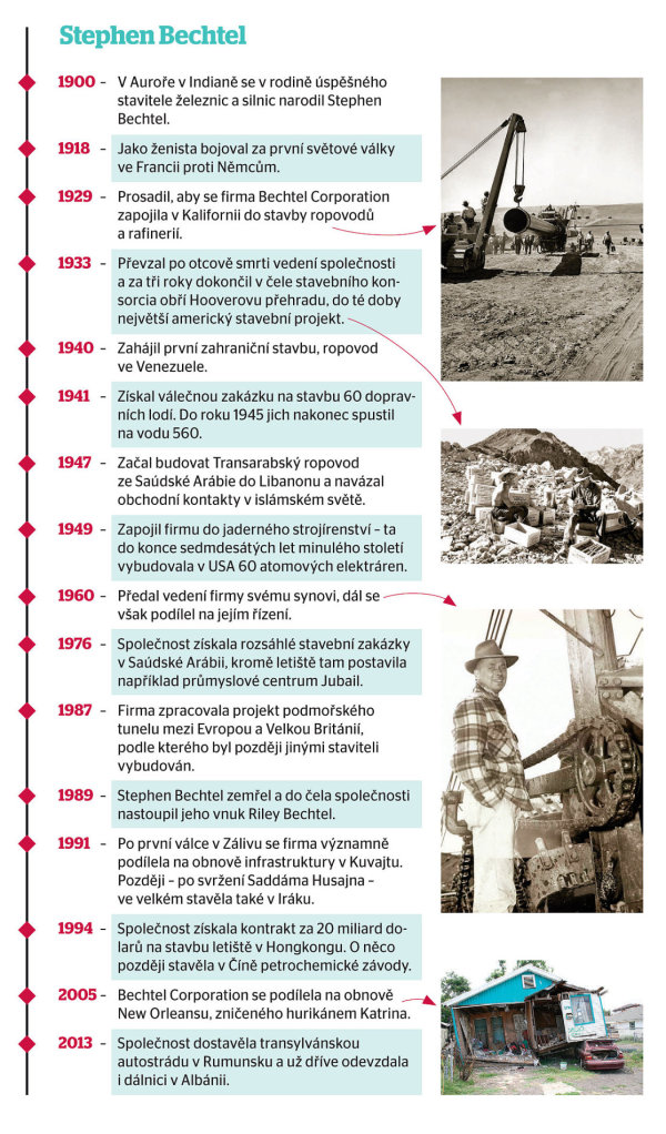 Američan Stephen Bechtel je příkladem pragmatického podnikatele, manažera a stavitele, který si potrpěl na megaprojekty. Proslavil se s nimi jak doma v USA, tak prakticky po celém světě. Byl totiž - i podle konkurence - většinou o krok před ostatními v oboru. A to díky vzácné kombinaci rozvážnosti a smyslu pro zdravé riziko.