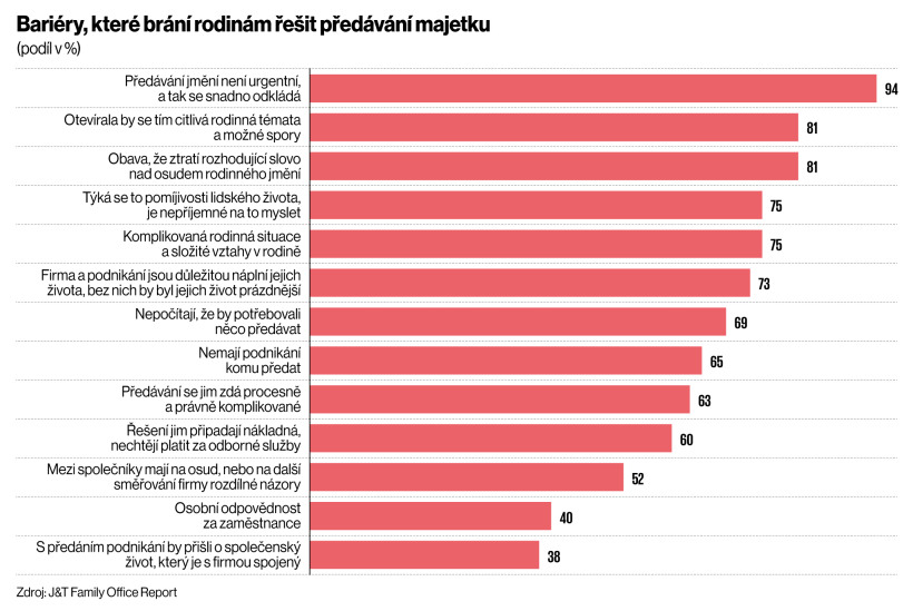 Zároveň je ale lidsky pochopitelné, že se zakladatelské generaci nechce „do důchodu“. Jak vyplývá z průzkumu J&T Family Office Report 2024, mezi největší bariéry bránící tomu, aby byznysmeni vůbec začali řešit předání majetku, patří skutečnost, že to připomíná pomíjivost lidského života (s tímto tvrzením souhlasily tři čtvrtiny oslovených), a také to pro ně může znamenat ztrátu společenského statusu (souhlasilo 38 procent dotázaných).