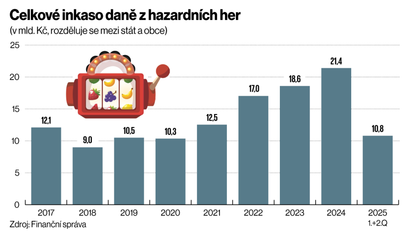 Rostou i příjmy provozovatelů, tedy částka, kterou hráči prohráli. Za první pololetí dosáhla 32 miliard, což je dvojnásobek oproti stavu před pěti lety. Stát tím pádem vybírá na daních z hazardu víc peněz, o které se dělí se samosprávou. Jenže ta se z růstu daňového inkasa radovat nemůže. Loni totiž začal platit vládní daňový konsolidační balíček, který sebral samosprávám veškerý jejich dosavadní daňový příjem z internetových her a ve prospěch státu jim ubral na příjmu z provozu automatů, tedy technických her, v kamenných provozovnách. A právě ty mají největší podíl na prosázených částkách. Obcím tak klesá podíl na daňovém inkasu. Dokládají to údaje pokladního plnění státního rozpočtu. Finanční správa už potvrdila, že za první pololetí činilo inkaso daně z hazardních her 10,8 miliardy korun. Stát z toho získal 8,8 miliardy korun (loni 6,4 miliardy). Na obce zbyly dvě miliardy.