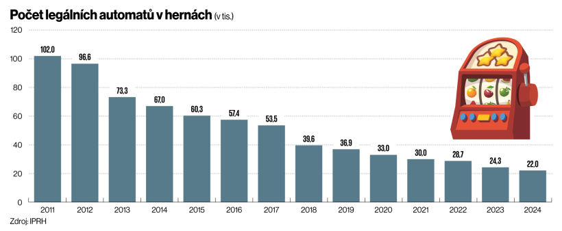 Herny z Česka skutečně mizí – ze 102 tisíc legálně provozovaných automatů v roce 2011 jich loni fungovala jen necelá pětina.