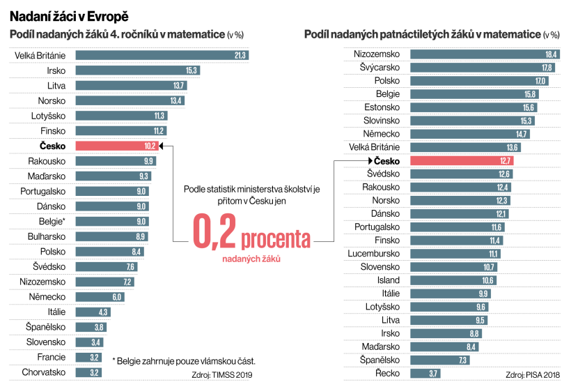 Čísla ministerstva školství hovoří o pouhých 0,2 procenta identifikovaných nadaných dětí na základních školách. Podle odborné literatury by jich přitom mělo být v populaci přibližně 10 až 15 procent (někdy se uvádí dokonce až 20 procent). Že je počet nadaných českých dětí podhodnocený, ostatně potvrdila i letošní studie institutu IDEA, jejímiž autorkami jsou ekonomky Miroslava Federičová a Alena Bičáková. Ty se ve své práci zaměřily na takzvané kvantitativní nadání, tedy výjimečné schopnosti v oblasti matematického a logického myšlení. Podle jejich zjištění se podíl takto nadaných žáků na základních školách v kategorii „čtvrťáků“ a patnáctiletých pohybuje mezi 10 a 13 procenty. V evropském srovnání tak patříme k horní třetině. A možná jsme na tom ještě lépe. Obě ekonomky ve své práci tvrdí, že zmíněných 10 až 13 procent je dolní mez a ve skutečnosti bude v populaci nadaných dětí pravděpodobně více.