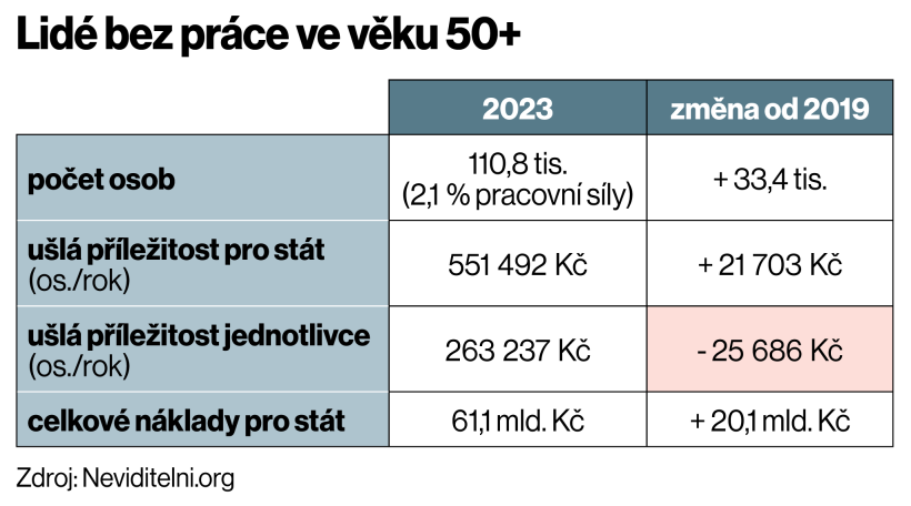 Že je zatím tahle část populace pro mnohé firmy neviditelná, ukazují i data o nezaměstnanosti: V červnu bylo bez práce téměř 316 tisíc lidí, přičemž více než třetina z nich – 110 tisíc – byli lidé přes 50 let. Ještě vyšší zastoupení mají lidé nad 50 let ve skupině těch, kdo práci marně hledají déle než rok. Takových lidí úřady celkem evidovaly více než 100 tisíc, přičemž zhruba polovinu tvořili padesátníci a starší. Jak vyplývá z analýzy Centra ekonomických a tržních analýz pro projekt Neviditelní, nejsou tím biti jen oni, ale i český stát. Tomu se zvyšují náklady související s vyplácením sociálních dávek i s tím, že musí za nezaměstnané odvádět zdravotní pojištění. Ročně dosahuje tato suma 61 miliard korun, přitom ještě v roce 2019 byla poloviční.