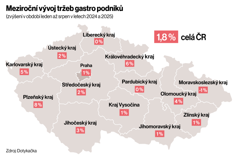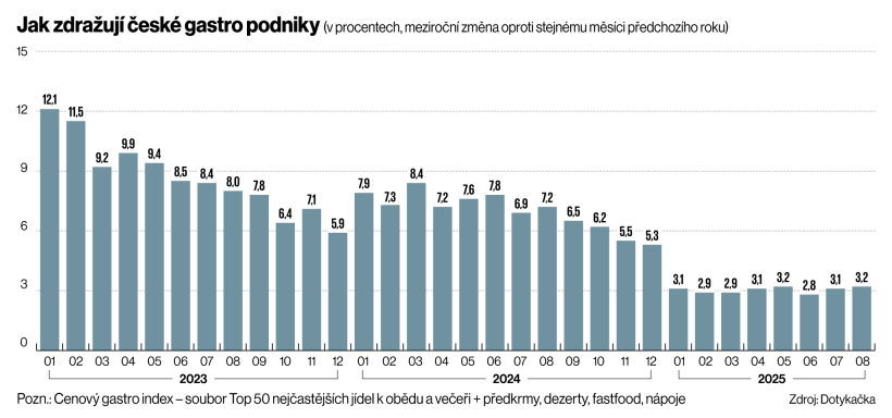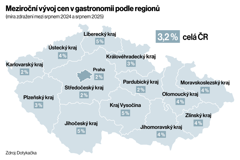 České gastronomické podniky zvedly v srpnu podle údajů poskytovatele pokladních systémů společnosti Dotykačka ceny o víc než tři procenta oproti stejnému měsíci loňského roku. Český statistický úřad (ČSÚ) uvádí, že to bylo dokonce necelých pět procent. Je to pomalejší tempo než v předchozích letech a na ziscích se neprojevuje. Obor trápí personální nouze a odliv zákazníků, kteří už nechtějí platit za nekvalitu.