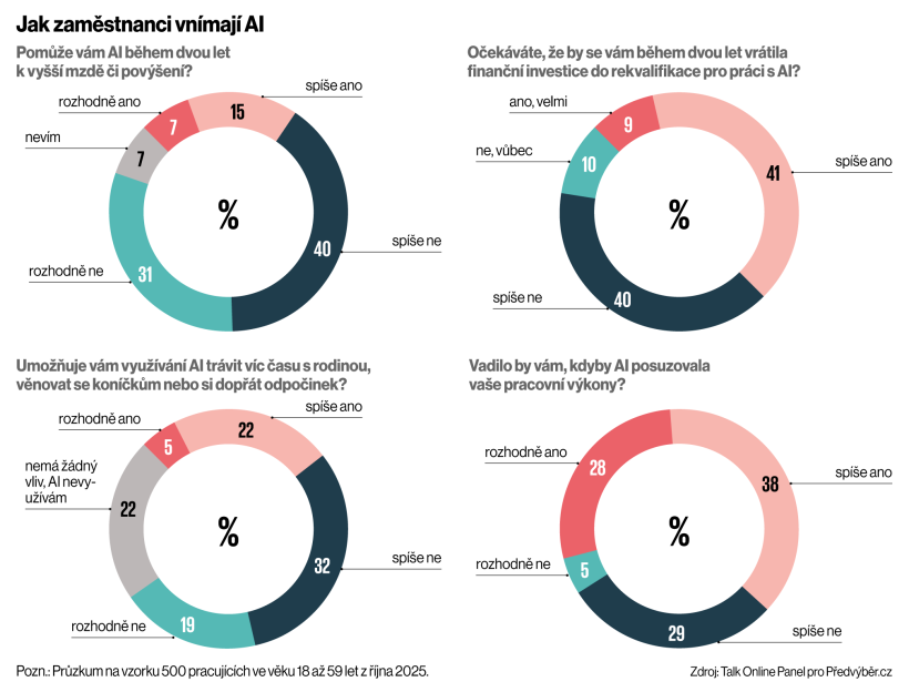 Údaje plynou z říjnového průzkumu personální společnosti Předvýběr.cz, který realizovala agentura Talk Online Panel na vzorku 500 pracujících. Více než 70 procent zaměstnanců si nemyslí, že AI jim v příštích dvou letech pomůže finančně či k povýšení. Jen necelá polovina respondentů je přesvědčena, že by se jim v krátkodobém horizontu vyplatila investice do rekvalifikace pro práci s AI.