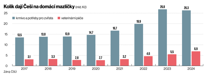 Patrně nejspolehlivější údaje o velikosti byznysu kolem domácích zvířat poskytuje Český statistický úřad, který útraty sleduje v rámci výběrového šetření rodinných účtů. Podle statistiků Češi loni utratili za krmiva, steliva, výživové doplňky a další potřeby pro psy, kočky a další malá zvířata 26,3 miliardy korun. To je takřka stejně jako o rok dříve; za posledních osm let šlo ale zároveň o jediné období, kdy útraty za mazlíčky stagnovaly.