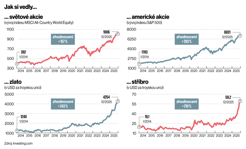Další riziko pro rok 2026 spočívá v tom, že inflace v USA se nepodvolí dvouprocentnímu cíli. Fundamenty naznačují, že by mohla setrvat kolem tří procent i ke konci příštího roku. Centrální banky chtějí snižovat sazby a podporovat ekonomiku, ale inflační tlaky nemizí. Ať už jde o cla a další rozpočtové stimuly, deglobalizaci či onshoring, které prodražují výrobu, nebo pokračující geopolitické konflikty. „Inflační očekávání jsou po posledních pár letech citlivá a mohou se zvednout rychle. Pokud to centrální banky donutí zvýšit sazby, akcie i dluhopisy to odskáčou,“ říká Hladký.