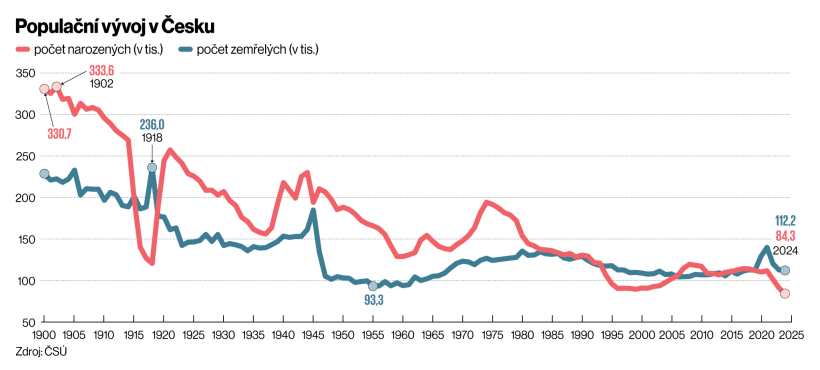 Ještě nikdy se v tuzemsku nenarodilo tak málo dětí jako v minulém roce. Úhrnná porodnost klesla na méně než 1,4 dítěte na jednu ženu. Česko tak pokračuje v sestupné spirále porodnosti a rychle se blíží k evropským státům s vůbec nejnižší porodností. Nejde však jen o problém starého kontinentu. V zemích OECD se úhrnná plodnost v členských zemích snížila z 3,3 dítěte na ženu v roce 1960 na pouhých 1,5 v roce 2024. Ještě větší demografický sešup prožívají asijské země a porodnost klesá i ve Spojených státech. Pokud se nic zásadního nezmění, hrozí podle demografů a ekonomů výrazný úbytek populace a ekonomické i sociální problémy.