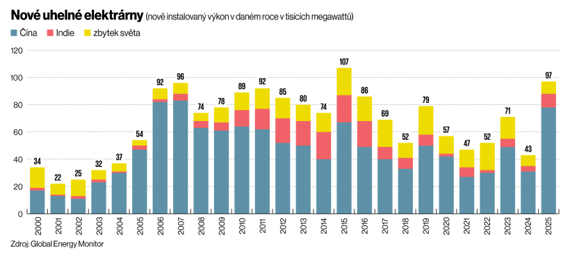 Během loňského roku připojila Čína k elektrické síti podle analýzy Global Energy Monitor více než 78 gigawattů nových uhelných elektráren. Nejvíc od roku 2007. „V roce 2025 do provozu uvedla více uhelných elektráren než Indie za celé uplynulé desetiletí,“ říká spoluautorka zprávy Christine Shearerová. Indie je přitom vnímána jako nastupující průmyslový gigant. Pro srovnání, oněch 78 gigawattů je přibližně desetkrát víc než instalovaný výkon všech dosud fungujících uhelných zdrojů v Česku.