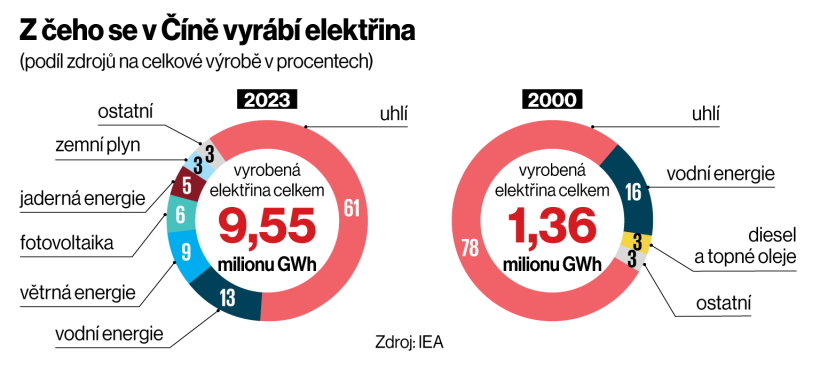 Čína dekarbonizuje odspodu. Nezakazuje uhlí administrativně, ale zaplavuje trh takovým množstvím zelených technologií, že uhlí začne postupně ztrácet ekonomický smysl samo o sobě. Mezitím ho ale klidně pálí dál, aby udržela nízké ceny pro své výrobce. Země hraje hru na průmyslovou dominanci a uhelné elektrárny pomáhají krmit rostoucí hlad po energiích. Ve srovnání s rokem 2000 nyní spotřebuje Čína sedmkrát více elektřiny. Procentní podíl uhlí zvolna klesá, ale stále je zhruba za 60 procenty elektřiny vyrobené v Číně.