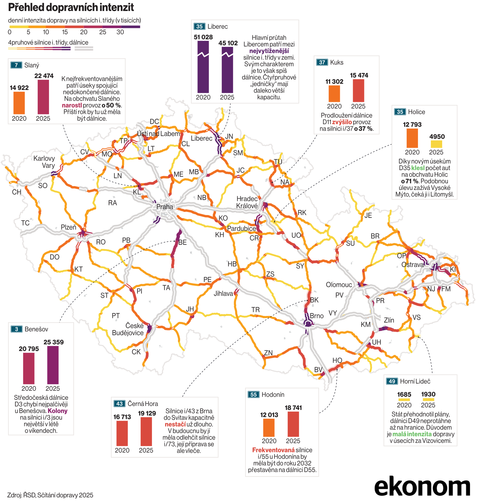 Za pět let se zatížení tuzemských silnic I. třídy zvýšilo o dalších šest procent. Průměrně jimi projede 9600 aut denně, v některých úsecích však i několikanásobně více, ukázala čerstvá data z posledního sčítání. To také odhalilo, kde nejcitelněji chybějí dálnice a kde naopak nové úseky dálnic místním obyvatelům výrazně pomohly.